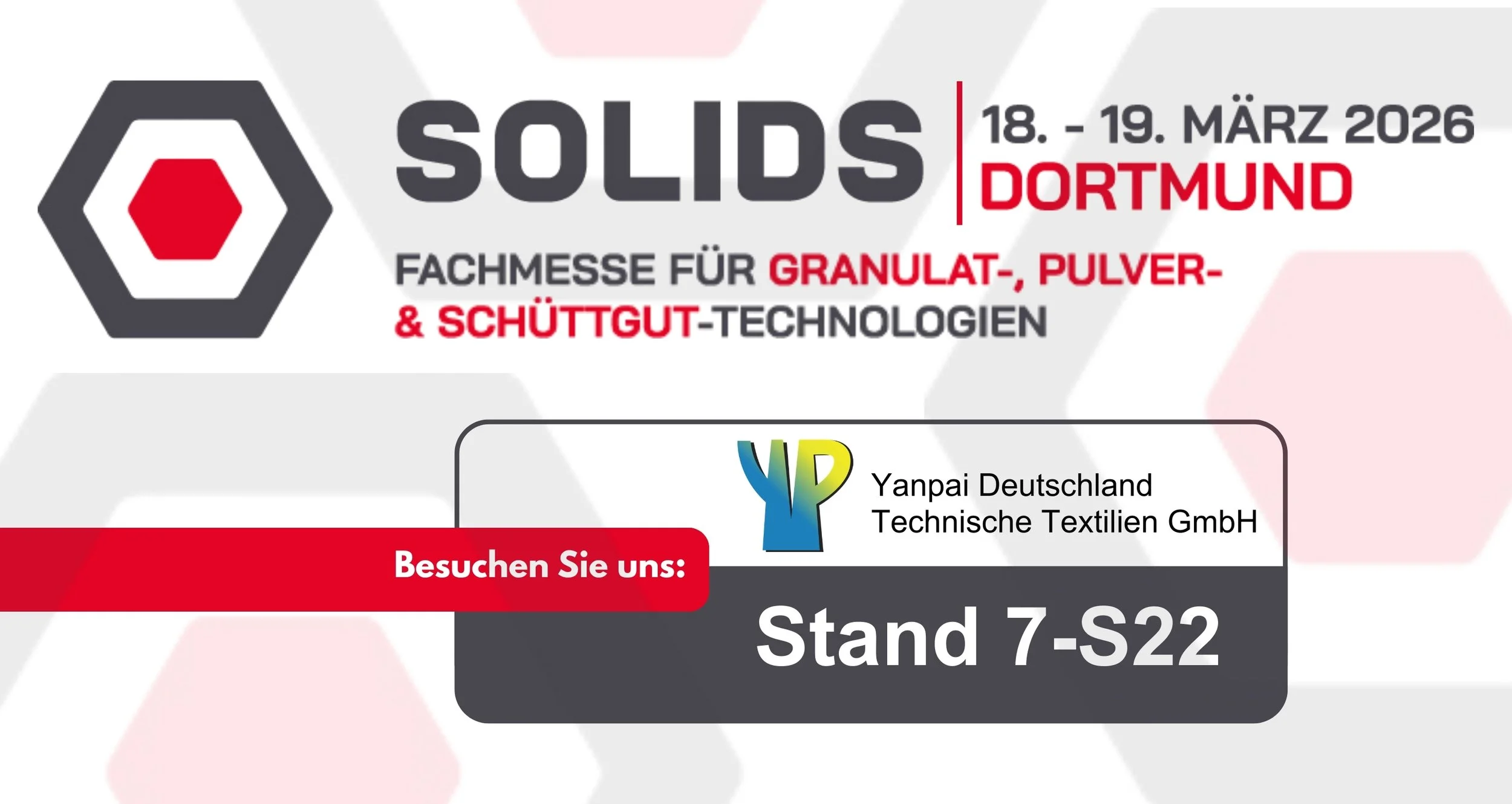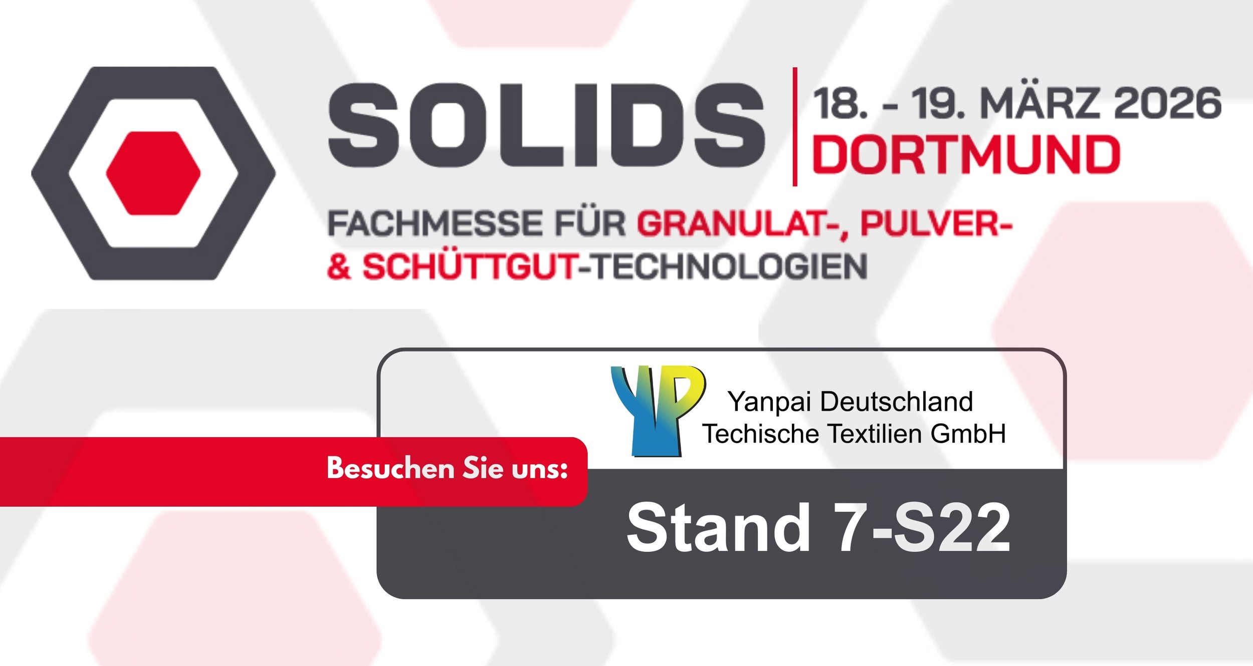Auf der SOLIDS Dortmund präsentieren wir unsere Materialien und Systeme für industrielle Anwendungen, insbesondere im Bereich Entstaubung und Schüttguttransport, wie z. B. unseren Airslide-Fluidisiergewebe & Nadelfilze.